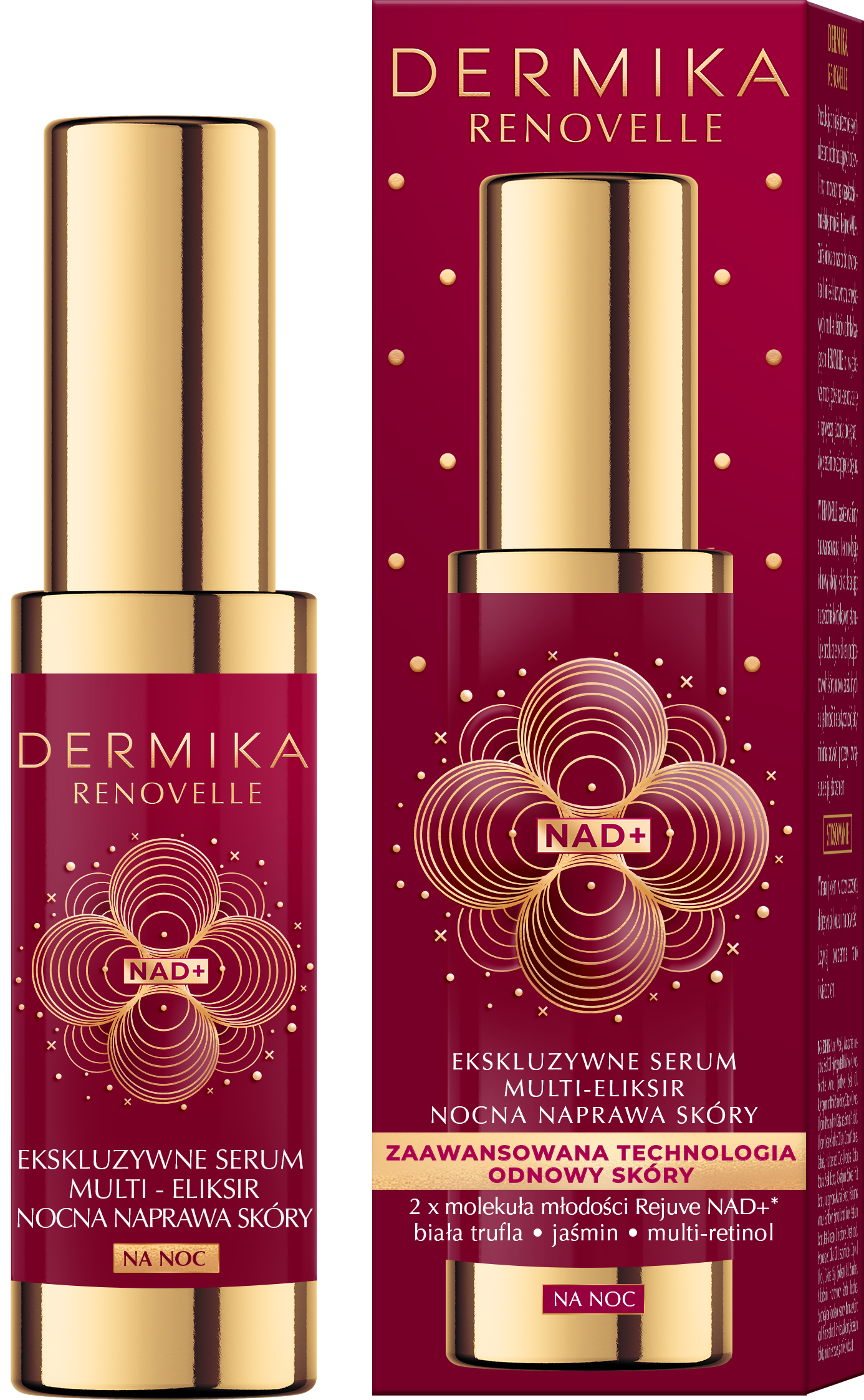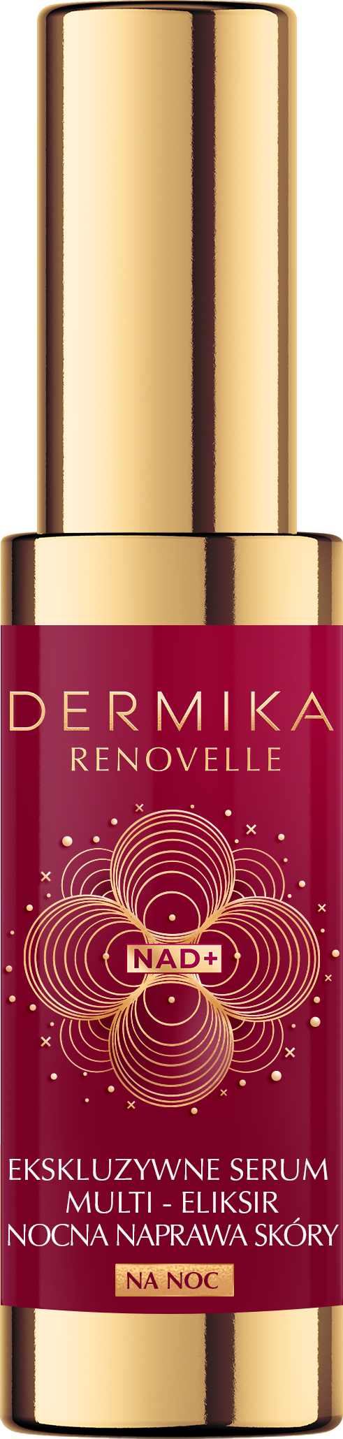 DERMIKA RENOVELLE EKSKLUZYWNE SERUM MULTI-ELIKSIR NOCNA NAPRAWA SKÓRY to skoncentrowana dawka luksusu i zaawansowanej pielęgnacji dla skóry dojrzałej, również wrażliwej.Bogata, kremowa formuła zawiera podwójną, mocną dawkę molekuły młodości Rejuve NAD+* oraz multi-retinol, dzięki czemu serum jest idealne do nocnej regeneracji, odnowy i aktywacji naprawy skóry na wszystkich jej poziomach podczas snu. Głęboko rewitalizuje naskórek przez całą noc, aby rano cera zachwycała świeżością, promiennością i zdrowym blaskiem.