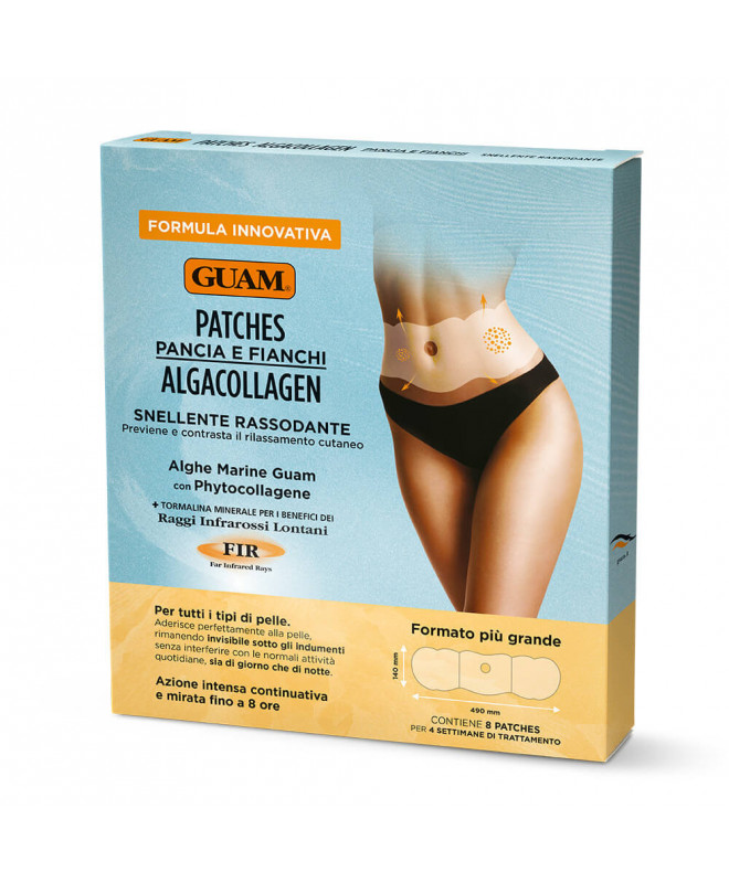 Guam Pantches Pancia e Fianchi Algacollagen to innowacyjne plastry wyszczuplające, które zostały zaprojektowane z myślą o redukcji tkanki tłuszczowej w okolicach brzucha i bioder. Produkt łączy działanie alg morskich z nowoczesną technologią Algacollagen, która wspomaga modelowanie sylwetki i poprawia jędrność skóry. Dzięki zastosowaniu plastra, składniki aktywne wnikają głęboko w skórę, zapewniając intensywną i długotrwałą kurację wyszczuplającą.